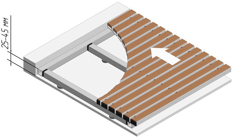 Особенность расположения продольных и поперечных балок предотвращают поломку укладываемого покрытия или получение травмы при прохождении по покрытию независимо от наименования и количества уложенных изделий на опорную конструкцию.