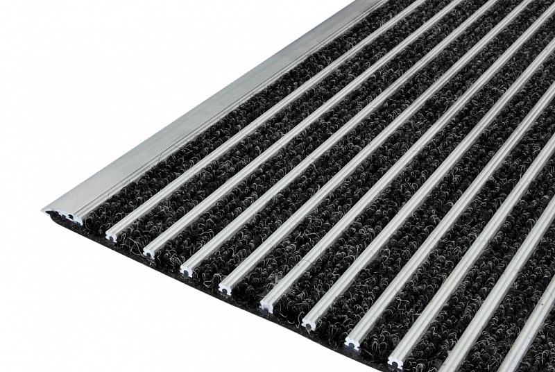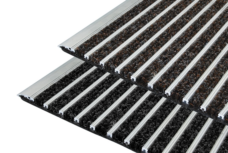 Грязезащитные ворсовые ковры Каскад c уникальной структурой поверхности в виде переменного сочетания ворса и алюминиевого скребка.